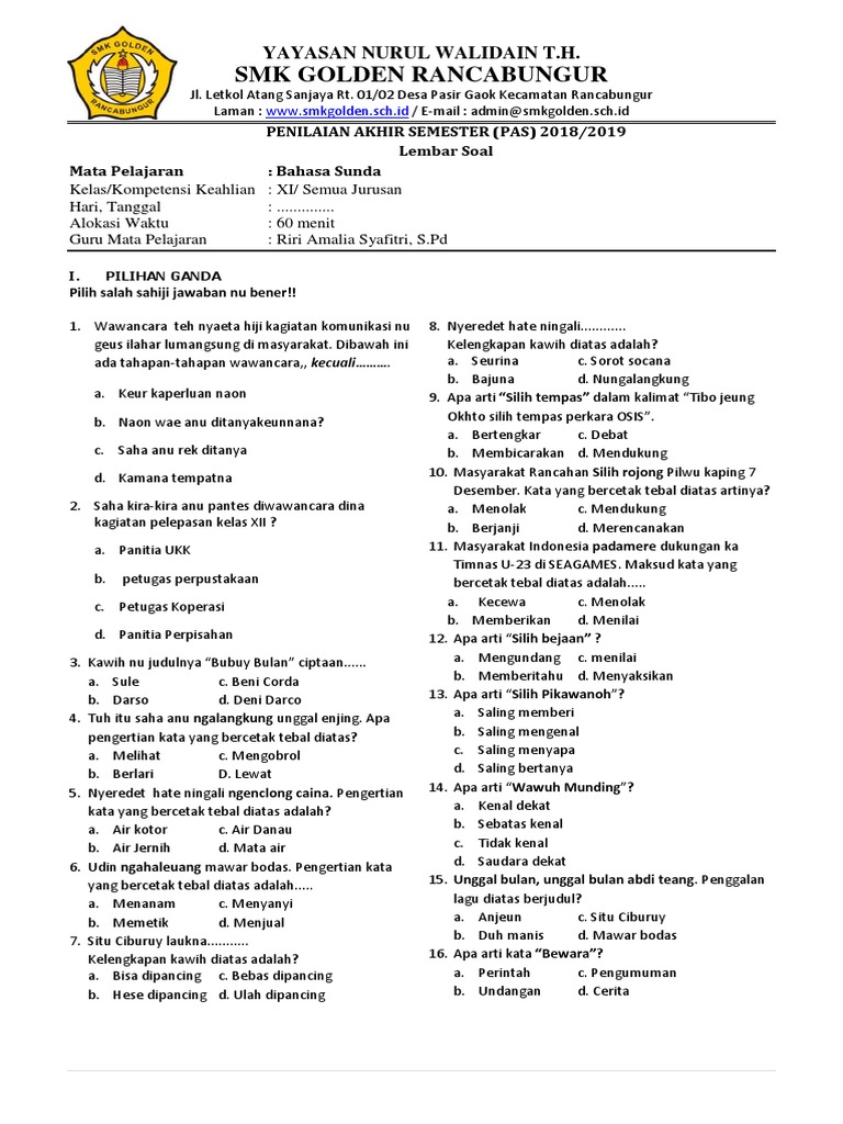 Contoh Soal Pilihan Ganda Bahasa Sunda Tentang Warta ... from imgv2-2-f.scribdassets.com Berikut ini kumpulan contoh warta tentang bencana banjir menggunakan bahasa sunda loma hartina warta sunda nya éta béja, béwara, atawa informasi anu ditepikeun maké basa sunda. Berikut adalah salah satu contoh pidato bahasa sunda singkat (pendek) tentang kemerdekaan yang bisa dicontoh dan dimodifikasi. Partéy démokrat negeskeun tacan saya rasa cukup banyak kumpulan contoh artikel tentang warta atau berita bahasa sunda yang sudah saya contoh warta bahasa sunda tentang gempa bumi dan gunung meletus. Pamiarsa sadayana, nagara indonesia nuju kenging musibah, saentosna ntb, ayeuna kota palu anu kenging musibah gempa. Saran sebaiknya pengetahuan mitigasi tentang bencana gempa bumi ditanamkan sejak kecil denga tujuan untuk menciptakan generasi yang. Assalamualiakum warahmatullahi wabarakatuh ibu guru nu dipihormat sareng sadaya rerencangan, saperjuangan nu dipikacinta. Contoh warta sunda pendek brainly co id pertanyaan tentang warta bahasa sunda, contoh warta sunda pendek 6854702 menulis warta apakah itu warta dalam bahasa indonesia atau warta sunda adalah pekerjaan yang biasa dilakukan oleh seorang jurnalis atau wartawan dalam menulis sebuah. Nah, demikianlah kumpulan 7 artikel warta tentang bencana alam dari mulai tanah longsor, gempa, dan banjir dalam bahasa sunda.